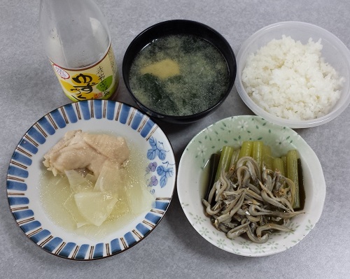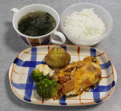 今日の朝ご飯、タンパク質はお昼にとる予定で~す、新ジャガが美味しいですゆるゆるラップでチンして、オーブントースターで皮を焼きました